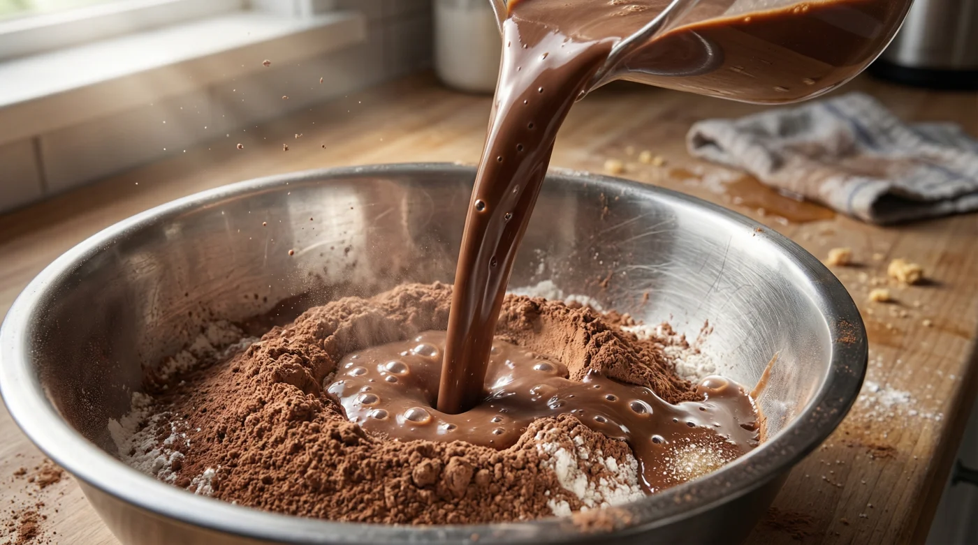 Je ruikt direct een troostende, rijke geur opstijgen uit de kom. Roer kalm en zachtjes met een houten lepel of spatel. Je zult zien dat het beslag direct transformeert; het wordt donker, prachtig glanzend en aangenaam zwaar, bijna alsof je schept door gesmolten chocolade-ijs. Het is een visuele bevestiging dat je op de goede weg bent.
