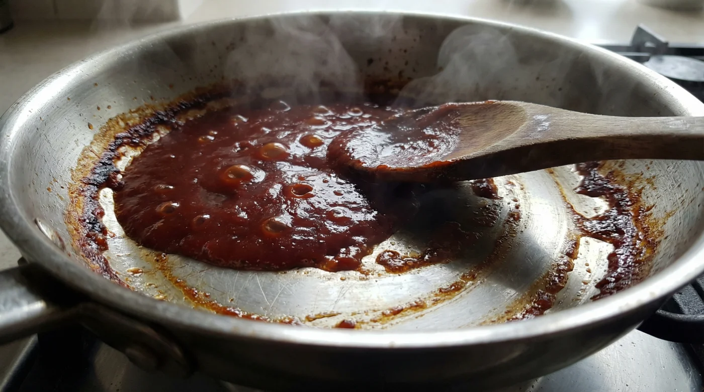 Zodra de randjes van de felrode massa donkerrood tot bijna roestbruin kleuren, mag je ingrijpen. Begin direct en stevig met roeren, en schraap met een houten lepel de gekarameliseerde stukjes zorgvuldig van de hete bodem. Dit specifieke moment is het punt waarop de azijn volledig verdampt en het umami-concentraat optimaal vrijkomt.